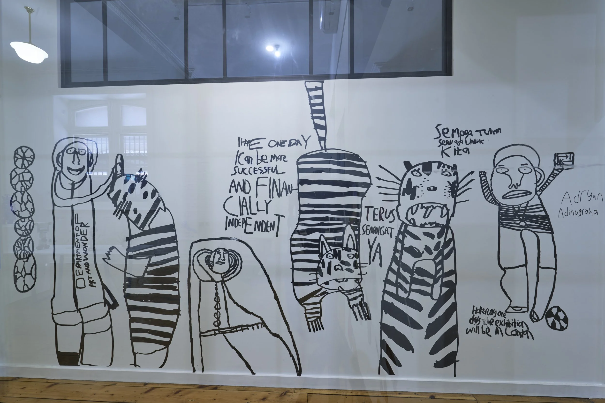 Adryan is our artist in residence and will complete a wall mural for Expanding Surrounding. Adryan, is a neurodivergent artist born in Ciamis, Indonesia, and recognised for his distinctive line work.