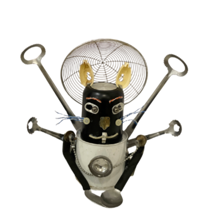 Inspired by his childhood surgery, which led him to describe himself as half robot, half human, Ilham explores robotic visual elements in his practice, spanning two-dimensional drawings and paintings as well as three-dimensional works in ceramics and mixed media.