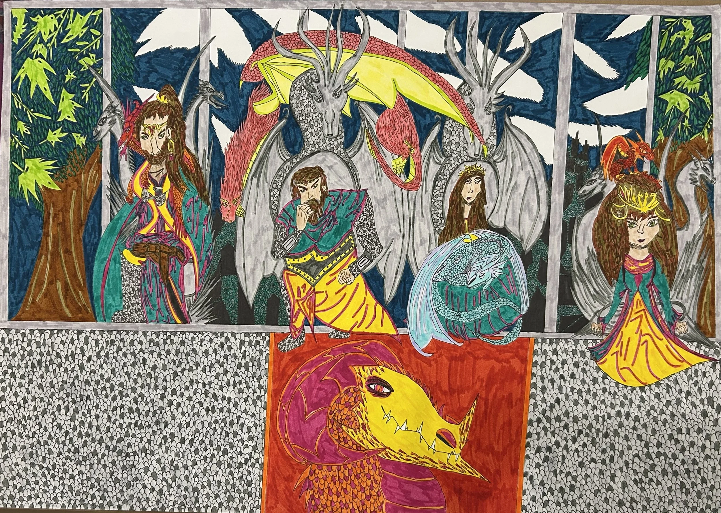 "Mr Magnificent" inspired by a little creature visiting my garden gate just doing their thing as Preymantis do! P.S Save the Preymantis Foundation!”—Denise Wust